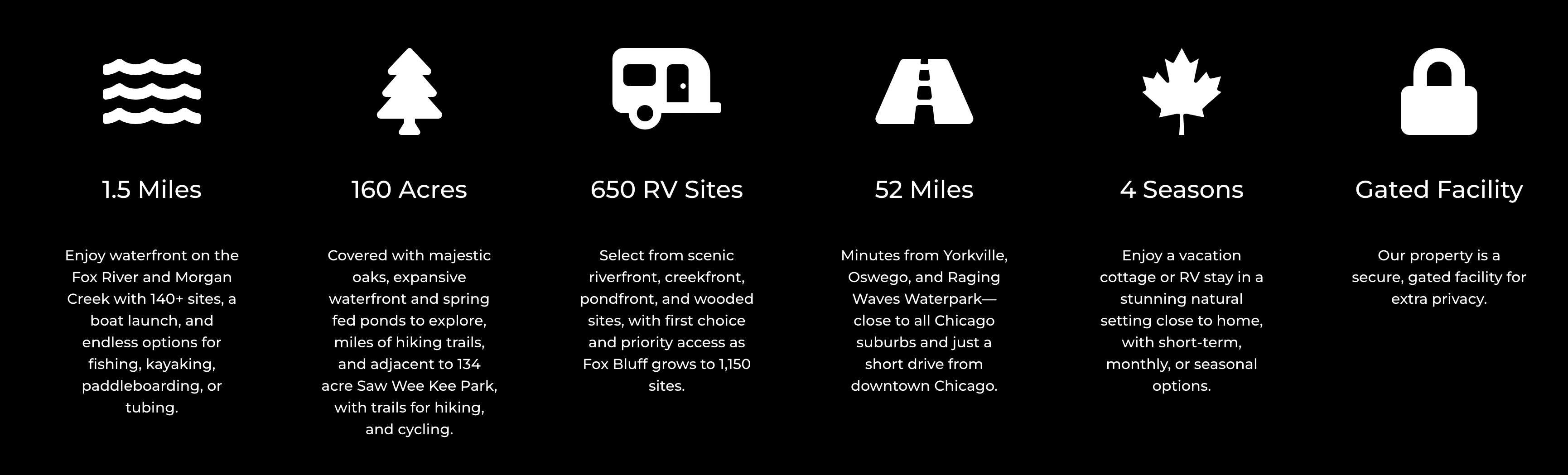 Select from scenic riverfront, creekfront, pondfront, and wooded sites, with first choice and priority access as Fox Bluff grows to 1,150 sites.