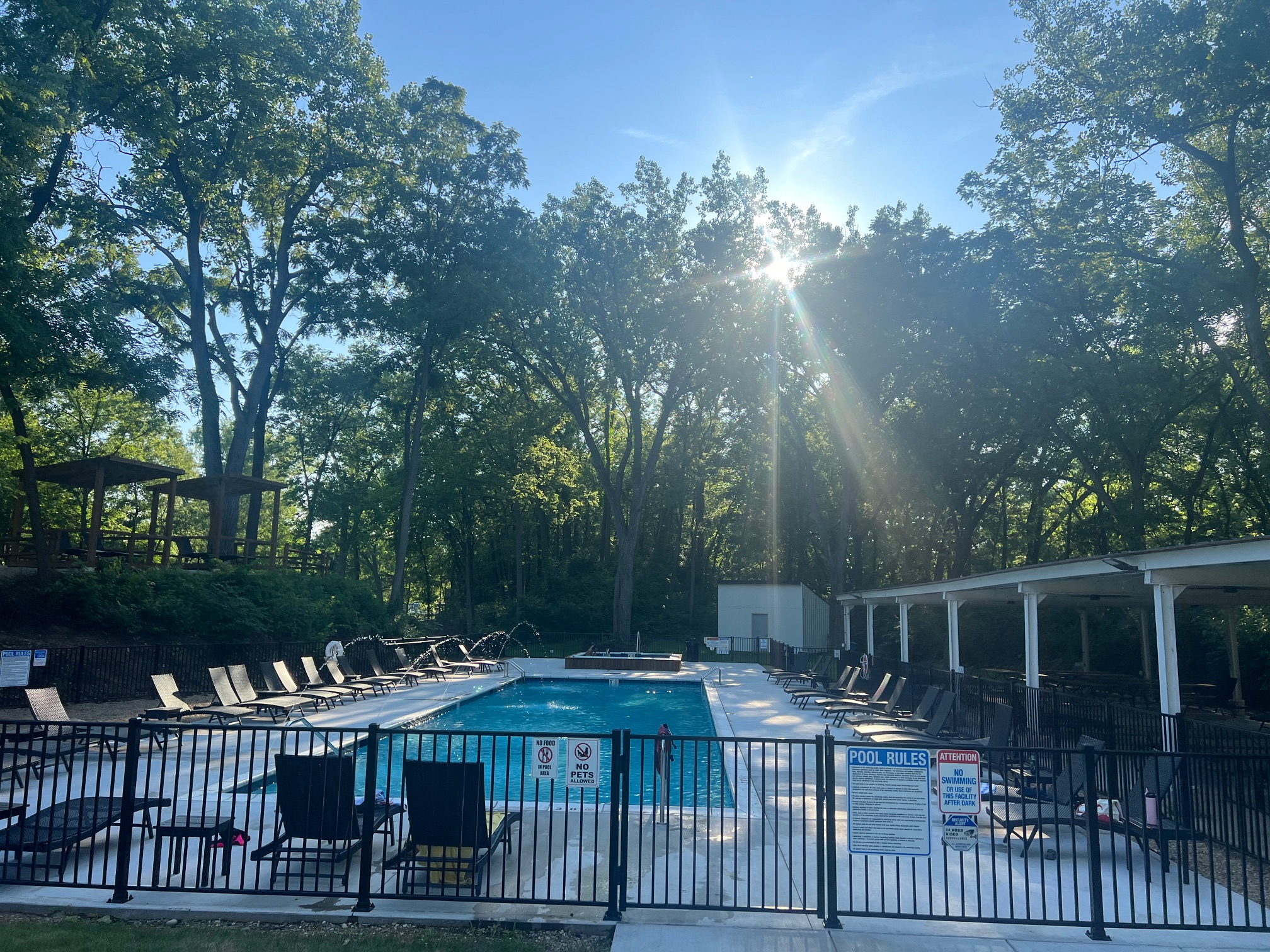 Relax in our new resort style swimming pool and 20 person hot tub, tucked in an oasis of towering Oak trees. Enjoy yourself on the hilltop in one of our first-come-first-serve cabanas!